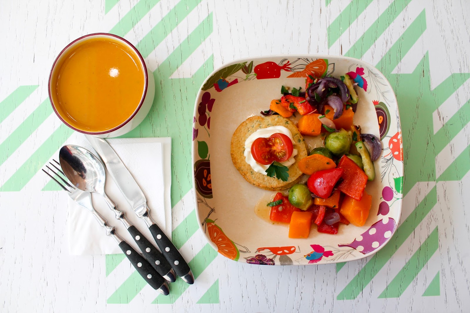 | Тыквенный крем-суп + оладьи из цветной капусты, украшенные творожным сыром и черри + запеченные овощи |