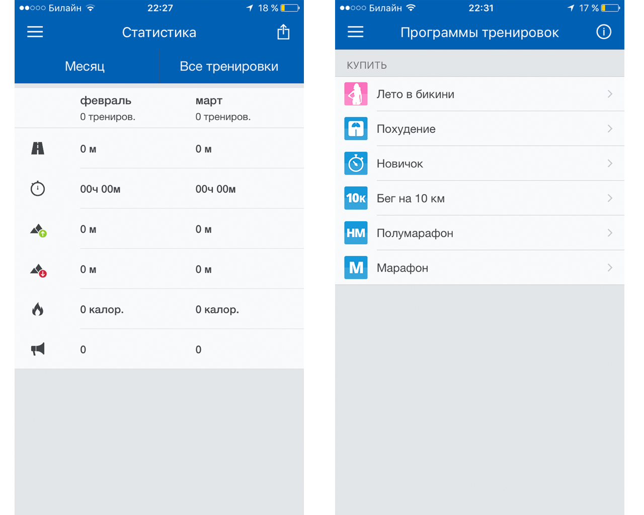 - программы тренировок. Это отличная опция для всех! Тут есть не только планы подготовки к десятке, полумарафону и марафону, но и тренировки для похудения!