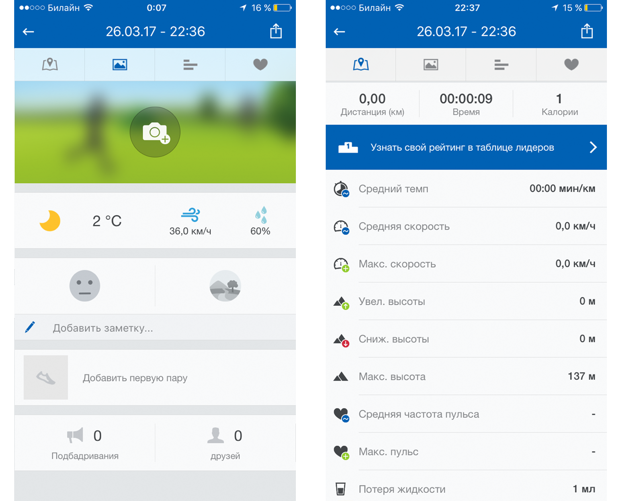 При подключении к интернету во время тренировки вторая вкладка покажет температуру воздуха и наличие осадков во время тренировки, кроме этого вы можете оставить там заметку, чтобы в будущем вспомнить о деталях тренировки.