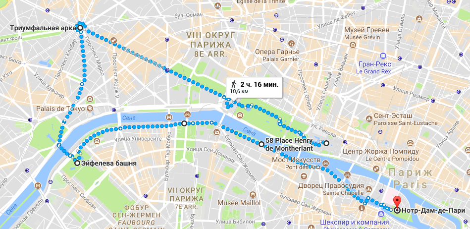 На этом маршруте вы увидите Лувр, Сад Тюильри́, Площадь Согласия, Елисейские поля, Триумфальную арку, Эйфелеву башню, набережную реки Сена, музей Орсе, остров Сите и Нотр-Дам де Пари!